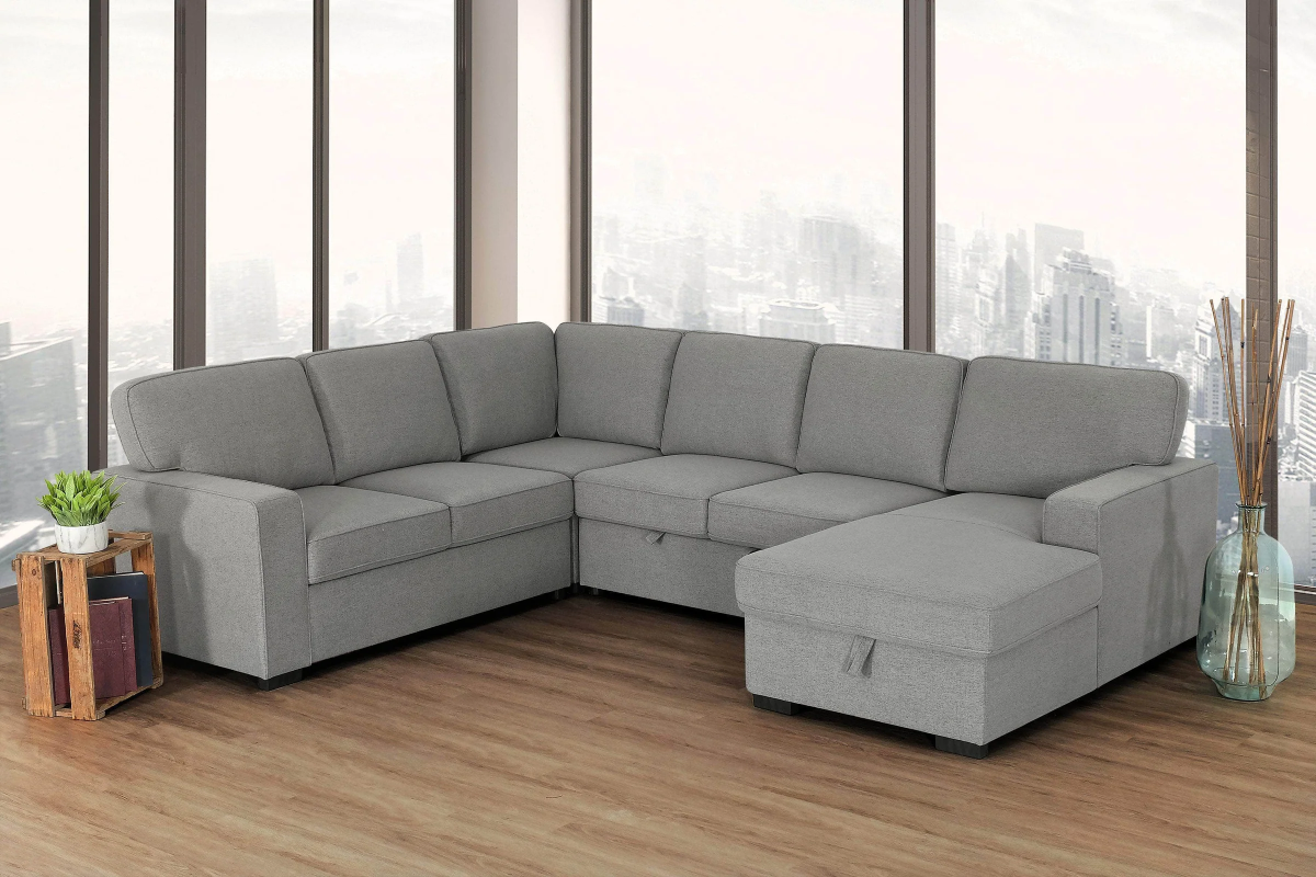 The Morandi multi-functional sleeper sectional ensemble features a contemporary style. It can quickly and easily convert from seating to a large, flat sleeping surface. Keep your room tidy and organized with the storage space at the base of the chaise. The grey fabric upholstery fits in with today's living room designs.Read More