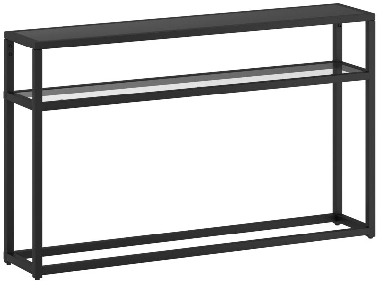 Beautiful contemporary console table - the clean line design will elevate the design factor of any room. The all black finishing - from the MDF top shelf to the square metal frame - is accented perfectly with the clear glass second shelf. The narrow depth of this table makes it perfect for tighter hallways or entryways.Read More