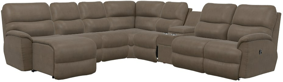 Turn casual evenings into cozy family nights with our Trouper sectional. Sink into one of the sculpted bucket seats and let the split back cushions provide soft support for your head, neck and lumbar region. Adjust the back and chaise legrest for personalized reclining comfort, or lean back without raising your feet.Read More