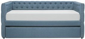 The covered in blue fabric, the profile of the daybed is defined by double nailhead accenting while the interior and exterior panels feature button tufting that lends to the modern traditional styling of the group. The accompanying the under-bed trundle pulls out to accommodate your additional sleep space needs.Read More