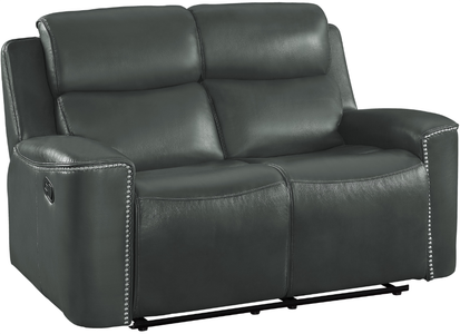 Utilizing modern lines with traditional accenting, the Altair Collection will be a unique addition to your modern home. This seating group is available in gray or black leather gel match, with decorative high-polish nailhead accent, for ultimate decorative versatility in placement within your space. Manual reclining mechanisms engage with the pull of the side-mounted tab, taking you from seated to prone in an easy movement.