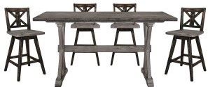 A gray finish graces the solid rubberwood dining group highlighting the veneer. Providing visual interest beyond the classic styling, are the alternate finishes of the accompanying chairs, offered in black sand-though and white sand-through. The chairs also feature a swivel mechanism, lending to ease of motion while seated.Read More