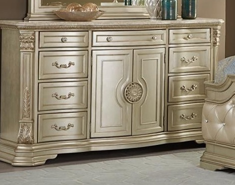 Canted pilasters, marble tops, sunburst medallion, and classic button and bale hardware further accent the case goods. The heavily framed headboard features champagne-tone bonded leather with crystal button tufting. Birch veneers is highlighted by a champagne finish with accentuating tipping.