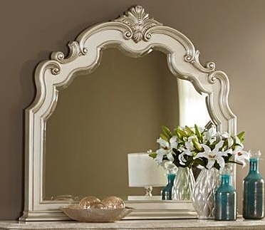 Traditional elements of Old World European styling are blended to create the look of the Antoinetta Collection. Acanthus leaf motif as well as bead and heavily carved moldings serve as the initial draw to the traditional design. Canted pilasters, marble tops, sunburst medallion, and classic button and bale hardware further accent the case goods. The heavily framed headboard features champagne-tone bonded leather with crystal button tufting. Birch veneers is highlighted by a champagne finish with accentuating tipping.Read More
