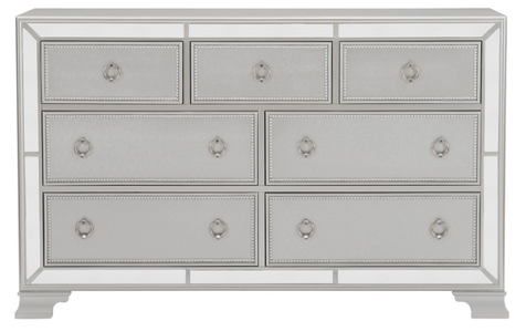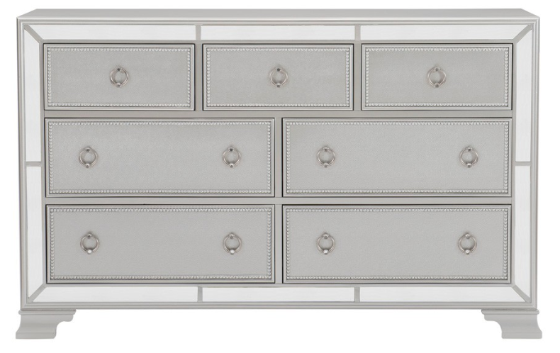 The reflection of your glamorous image is one of striking style and classic sophistication, all illuminated by the boldly designed Avondale Collection. Mirrored framing immediately draws your eye to the modern-traditional profile of the case goods and bed as do the clipped corners on the bed mirror and vanity. Silver finished drop pull hardware centers each bead-molding adorned drawer front. The silver finish of the collection is illuminated not only by the reflected light off the mirrors, but it is also enhanced by the contrasting silver-gray crystal button-tufted accents on the headboard and footboard. Beyond the traditional case goods that are offered, an available vanity further enhances your space. Glass is mounted between the two vanity drawer units. Jewelry hooks provide convenient storage behind the folding mirrors and the available coordinating stool complements the collection.Read More