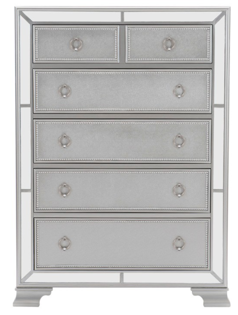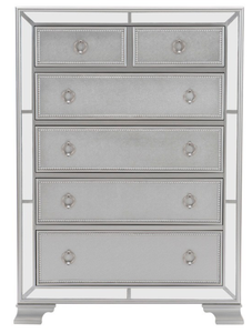 The reflection of your glamorous image is one of striking style and classic sophistication, all illuminated by the boldly designed Avondale Collection. Mirrored framing immediately draws your eye to the modern-traditional profile of the case goods and bed as do the clipped corners on the bed mirror and vanity. Silver finished drop pull hardware centers each bead-molding adorned drawer front. The silver finish of the collection is illuminated not only by the reflected light off the mirrors, but it is also enhanced by the contrasting silver-gray crystal button-tufted accents on the headboard and footboard. Beyond the traditional case goods that are offered, an available vanity further enhances your space. Glass is mounted between the two vanity drawer units. Jewelry hooks provide convenient storage behind the folding mirrors and the available coordinating stool complements the collection.Read More