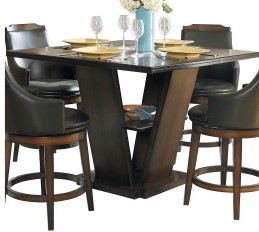 The oak veneer square table top features quartered book-match walnut inlay veneers with a heavily burnished finish.Supporting the uniquely veneered table top is a storage table base with a display shelf.Read More