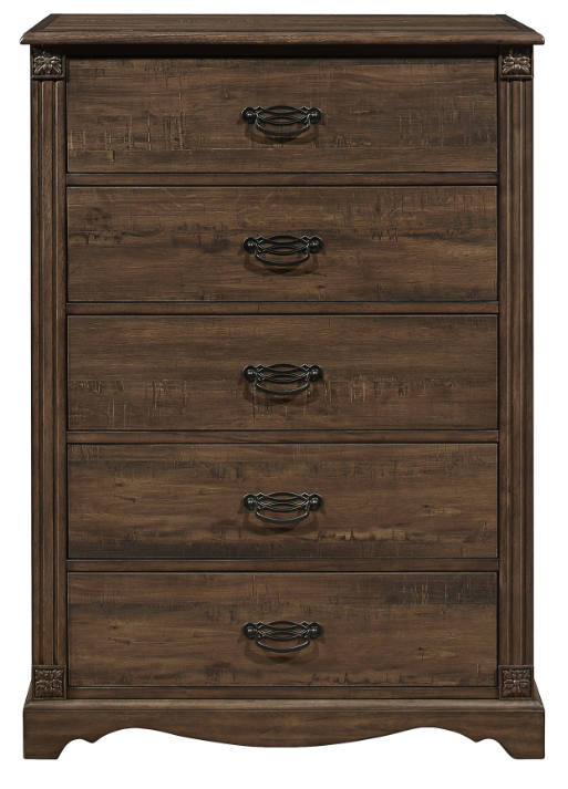 The intersection of transitional design and traditional accenting melds to create the rustic look of the Beaver Creek Collection. Traditional elements such as fluted pilasters, squared medallion accent and classic center-drop dark-finished metal hardware, play effortlessly against the rustic brown finish of the collection. Drawing your eye to the panel bed is the padded, button-tufted, dark brown bi-cast vinyl headboard insert.Read More