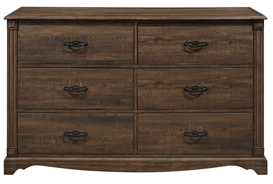 The intersection of transitional design and traditional accenting melds to create the rustic look of the Beaver Creek Collection. Traditional elements such as fluted pilasters, squared medallion accent and classic center-drop dark-finished metal hardware, play effortlessly against the rustic brown finish of the collection. Drawing your eye to the panel bed is the padded, button-tufted, dark brown bi-cast vinyl headboard insert.
