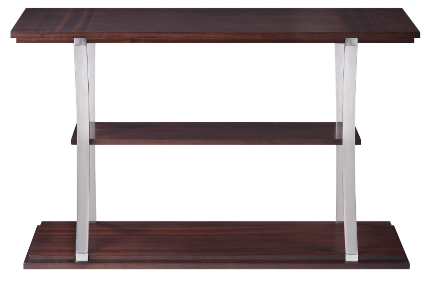The modern profile of the Bevan Collection will be a perfect accent for your living room décor. Providing contrast to the rectangular and square shapes of the available end table, cocktail table and sofa table is the round end table. The sofa table and square end table feature a middle shelf that will allow for additional display of your living room accessories. The dark cherry finish is enhanced by the concave-profile chrome support legs.