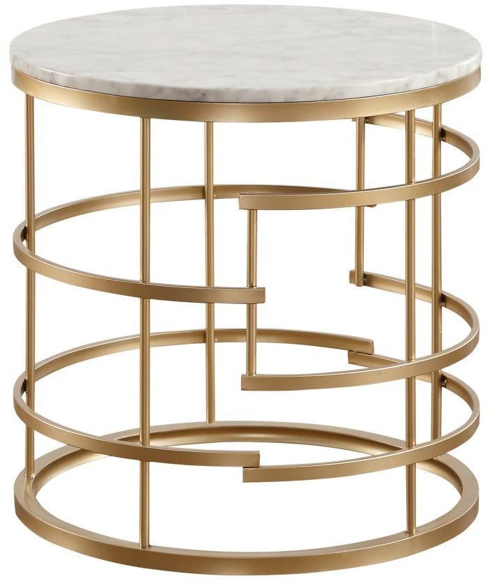 The look of elegant look of gold and marble paired with a hint of glamour and modern styling come together to create the Brassica Collection. Printed Carrera faux white marble provides stark contrast to the geometric inspired gold-finished round metal base of this sophisticated occasional collection. The collection is also offered in a silver finish.Read More