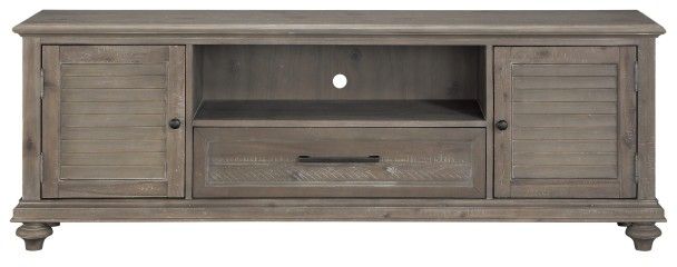 The solid transitional styling of the Cardano Collection creates an impactful design presence in your living room. Utilizing distinct accent techniques – plank effect, rasping, saw marks – and pairing them with traditional framing and a rich finish – light brown driftwood over acacia solids and veneers – creates a 72-inch media console that is worthy of your living room. Pewter-finished hardware mounted on the functional drawers and doors providing subtle contrast to the wood’s light finish. Open shelving allows for the convenient and unobscured access to your media devices.