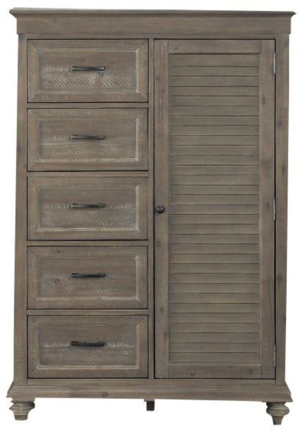The solid transitional styling of the Cardano Collection creates an impactful design presence in your home. Utilizing distinct accent techniques – plank effect, rasping, saw marks – and pairing them with traditional framing and a light finish – brown wood over acacia solids and veneers – creates dresser that is a perfect fit for your bedroom. Pewter finished hardware provides subtle contrast to the wood’s light finish. The drawers and door of the wardrobe chest open to reveal ample space for your personal items.