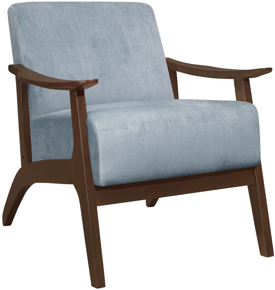 The frame of the Carlson Collection recalls a time when simplicity of profile was the height of style. The streamlined design of the chair's subtly sloped wood arms and legs is finished in dark walnut which serves to highlight the blue-gray velvet covering.Read More
