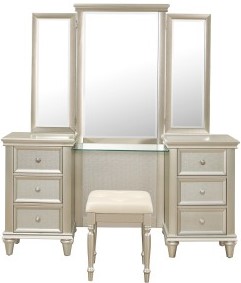 The high polished knob hardware stands out from the silver finish of the vanity dresser with mirror. With each of the aforementioned elements, subtle glamour will be achieved in the design of your elegant bedroom.Read More