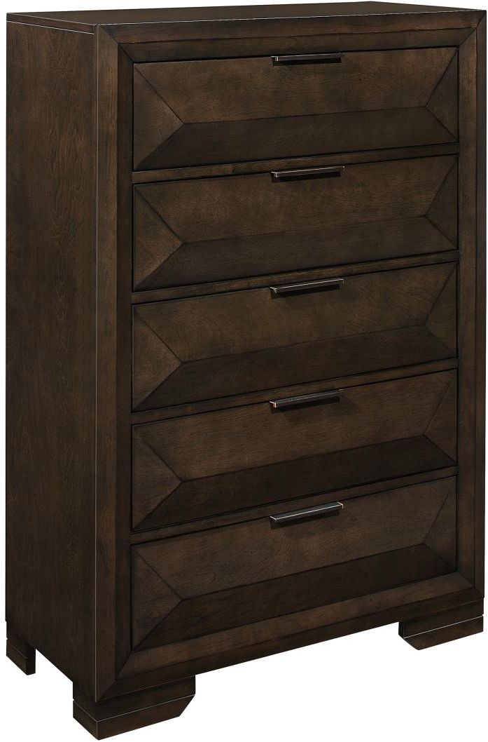 Contemporary design and convenient functionality intersect in the design of the Chesky Collection. Birch veneer is finished in a warm espresso in this unique bedroom offering. Raised panels provide visual interest to the drawer fronts. Complementing horizontal metal hardware lend additional accent to the case pieces.Read More