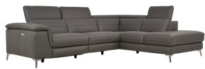 Headrests are adjustable to create a break in the profile of the sofa, while the end chair utilizes power reclining to provide additional support. The modified chaise provides ample space for relaxation whether seated or prone. Chrome finished legs complete the look of this sectional seating group.Read More