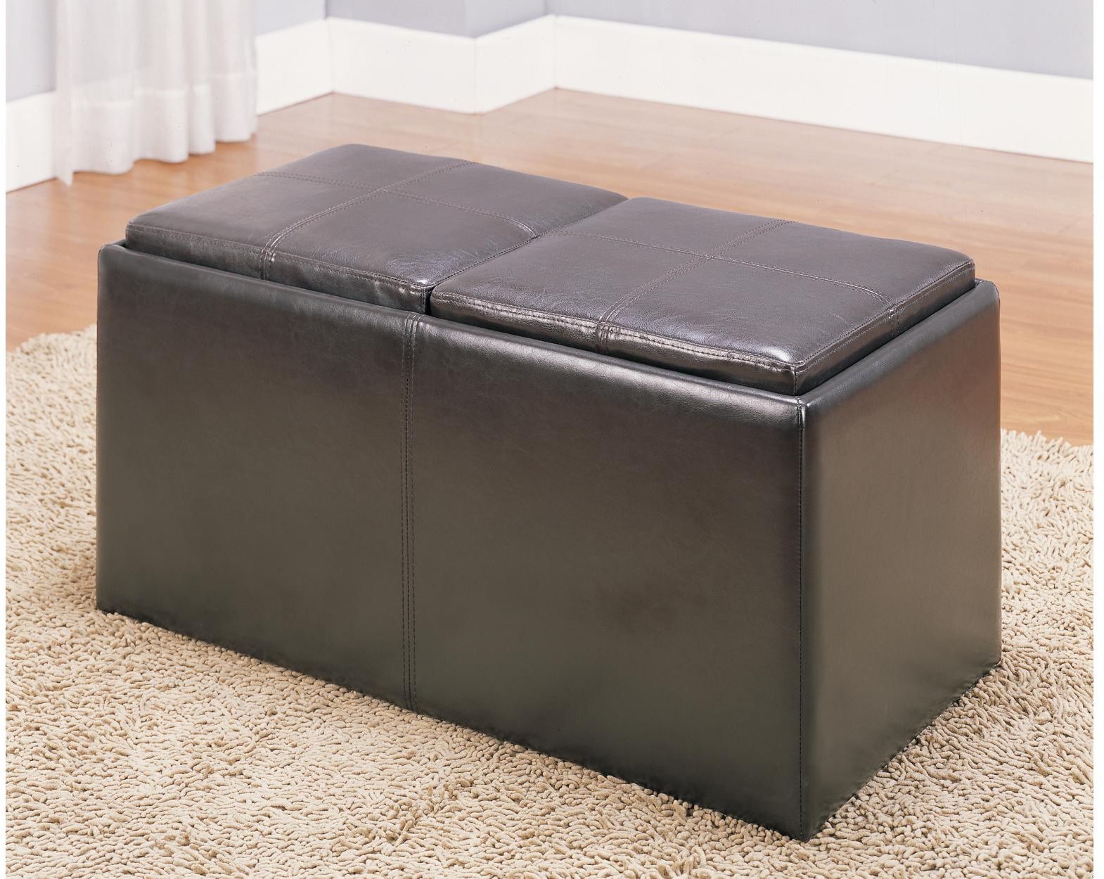 This functional two-seat storage ottoman reverses to reveal two individual serving trays and two cleverly stored stools. Covered in dark brown bi-cast vinyl.Read More