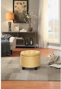 Providing a stylish accent for your home décor is the Cleo Collection. Round, with a removable lid that features button tufted accenting, and supported by slightly flared legs, this small accent piece makes a big statement whether you’re using it for additional seating, as a footstool or storage piece. The ottoman is offered in three versatile, trend-forward colours – yellow print, blue and beige.Read More