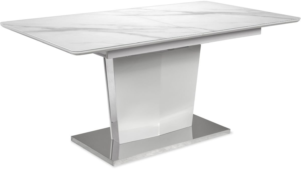Bright white and polished metal gives table an architectural feel and brings light to the dining area