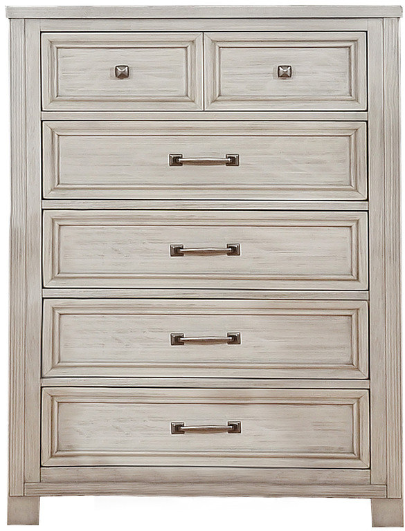 Tasteful charm and function unite with the Darcy collection. This dapper chest features five spacious drawers for your storage needs and is finished in antique white oak with picture frame detailing and handsome brushed silver metal hardware.Read More