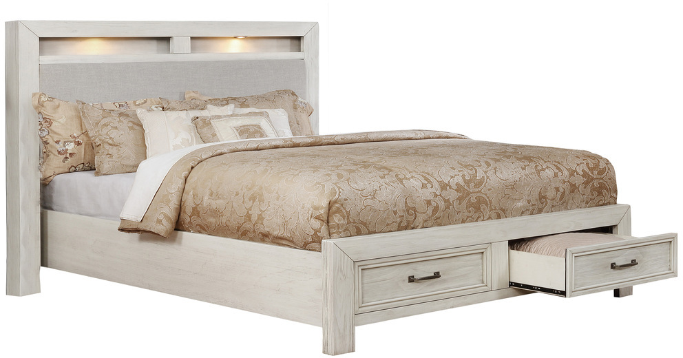 Tasteful charm and function unite with the Darcy bedroom collection. Finished in beautiful antique white oak, the Darcy bed is a wonderful focal point for your room with thoughtful details such as a headboard with a contrasting fabric upholstered panel, as well as two shallow nooks hosting LED lights.Read More
