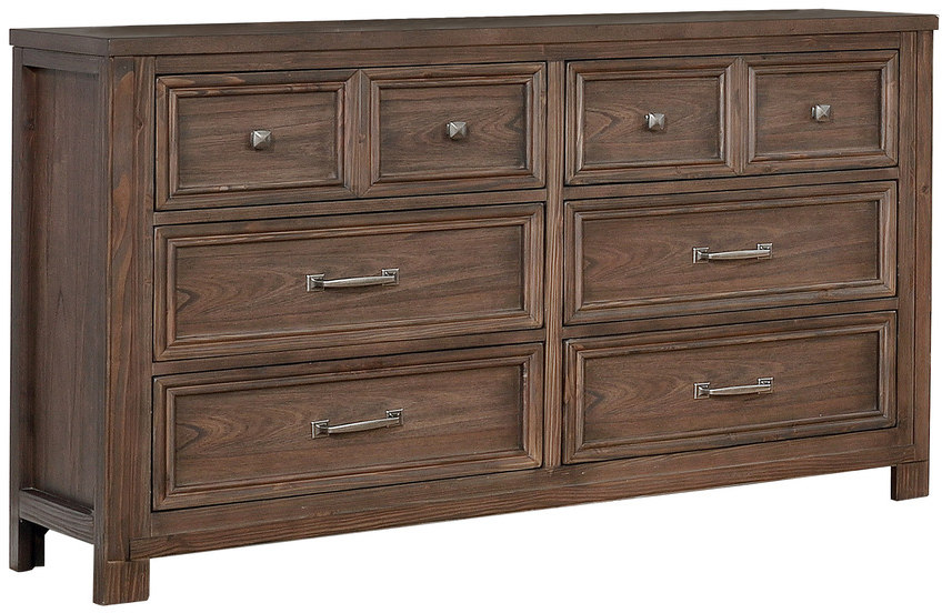 Tasteful charm and function unite with the Darcy collection. This dapper dresser features six spacious drawers for your storage needs and is finished in dark oak with picture frame detailing and handsome brushed silver metal hardware.Read More