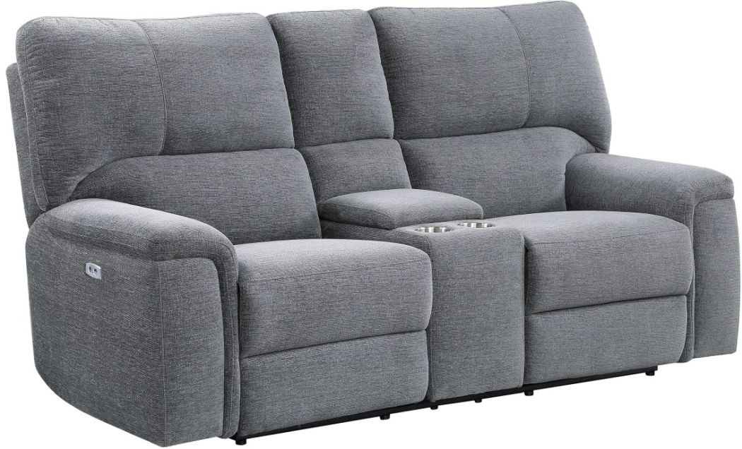 The unfettered design of the Dickinson Collection allows for perfect placement in homes with decorative themes that range from modern to transitional. Offered in charcoal chenille, the love seat features power motion reclining mechanisms. The power enhanced units feature adjustable headrests and electronically assisted recline. The love seat features a console with cup holders and hidden storage space. The expanse of the streamlined pillow-top arms furthers the comfort level of your downtime.