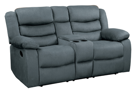 The transitional design of the Discus Collection provides a classic look for your casual living room. The decorative versatility of the gray microfiber fabric covering allows for perfect placement in your living room. Contoured plush seating is enhanced by the dual recliners of the love seat. Creating additional function is the console of the love seat that provides secure storage of beverages and lift top storage. The reclining mechanism is engaged with a pull of the side mounted tabs, taking you from seated to prone in an easy motion.