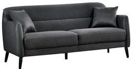 Details such as piped seams along the slightly flared arms and the indented horizontal stitching running across the back come together to lend a tailored touch to this collection. Upholstered in tasteful gray fabric that blends well with any décor, this sofa is paired with two matching fabric pillows.Read More