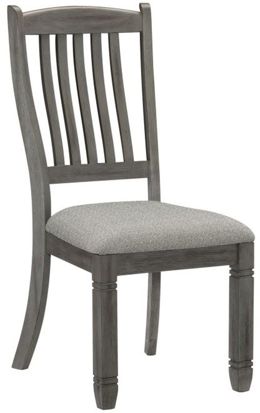 Inspired by the aesthetic of a casual country kitchen, the Granby Collection is an inviting gathering spot for mealtime with family and friends. The wood frame of the dining-height side chair is finished in antique gray and features a neutral tone gray fabric seat.
