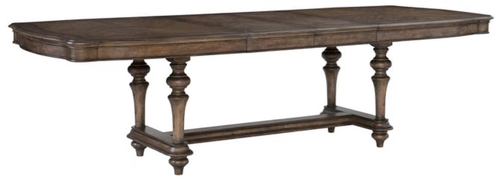 The formal styling of the table includes classic elements such as the turned double pedestal trestle base, routed table edge and decorative wood grain. The white oak veneer that graces the collection is highlighted with a brown oak finish.Read More