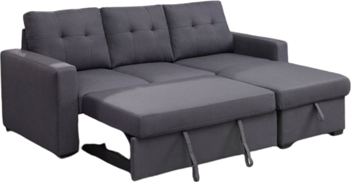 Button-tufted cushion backs appoint the attractive gray pull-out/pop-upSofa bed. The back cushions provide a back high enough to rest your head, while the pull out produces a bed for overnight guest or just stretching out. Store throws and linens in the lift-up chaise to keep your space neat and tidy.Read More