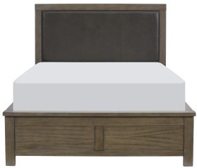 The queen platform panel bed features side rail storage and brown faux leather padded headboard insert. Flat black bar hardware fronts the drawers of the bed’s side rails, serving as complementing contrast to the brown-gray finish that graces the mindy veneer.Read More