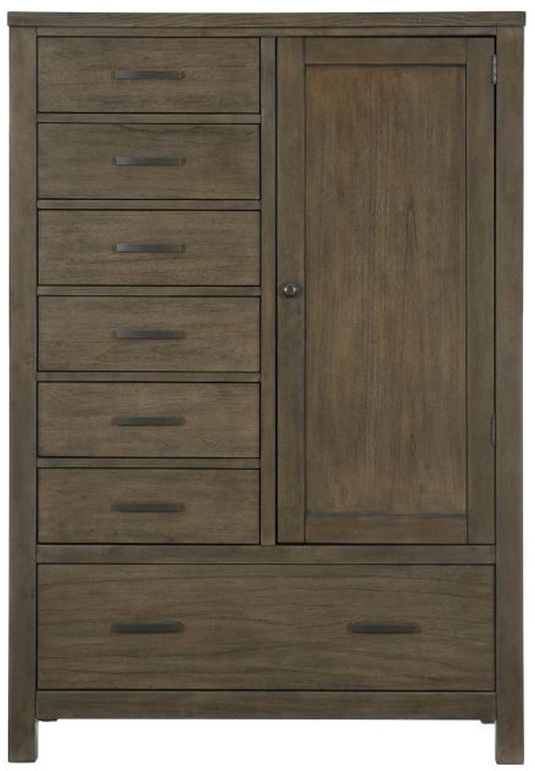 Clean lines blend with a soft rustic look to create the unique style of the Lantham Collection. Flat black bar hardware fronts the drawers of the wardrobe serving as complementing contrast to the brown-gray finish that graces the mindy veneer. The wardrobe’s drawers, behind sliding door shelving and clothing rod create ample storage space within your bedroom.