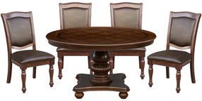 Supported by the pedestal base is the table’s round top where the magnificent parquet veneer is highlighted by the brown cherry finish. Heavily carved molding provides distinct accent to the table’s top. Brown faux leather covers the seats and backs of the wood-framed chairs with magnificent parquet veneer.Read More