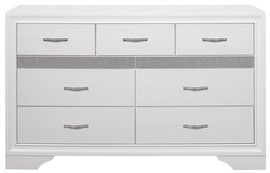The dresser’s embossed faux-wood veneer features a white finish that allows for the acrylic silver glitter front of the hidden jewelry drawer to shine. Comes with 7 dovetail drawers with metal on metal center glidesRead More