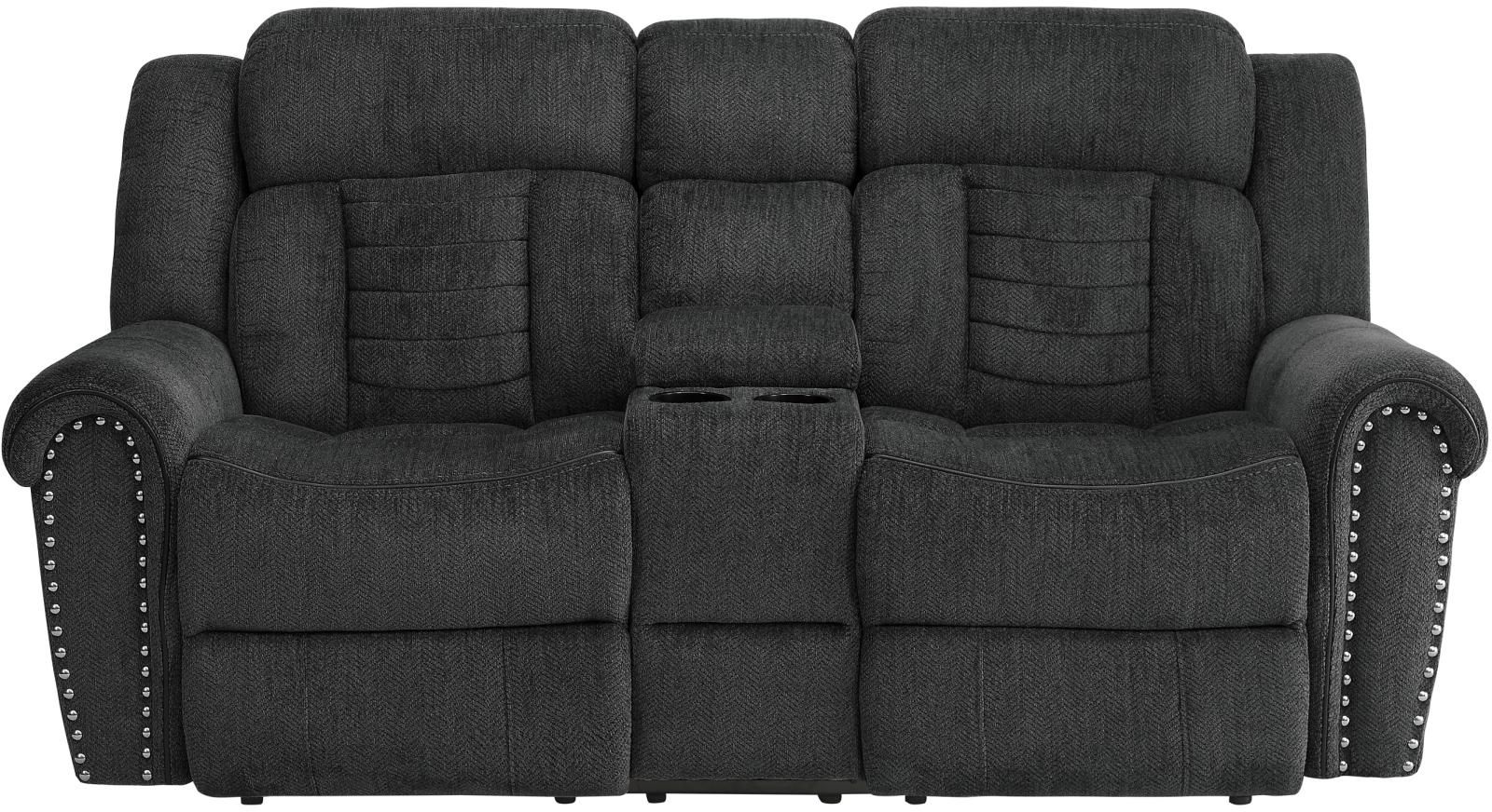 Designed for maximum comfort and styled for the transitional home, the Nutmeg Collection is a study in comfort. Contoured seating cradles you as you relax into the plush seat backs. Charcoal gray textured fabric is highlighted by nailhead accent and contrast contour welt, defining the profile of the collection. Manual motion mechanisms operate with the pull of a side-mounted tab, that once engaged, take you from seated to reclined in an easy motion. The sofa features dual reclining ends, as does the Loveseat.Read More