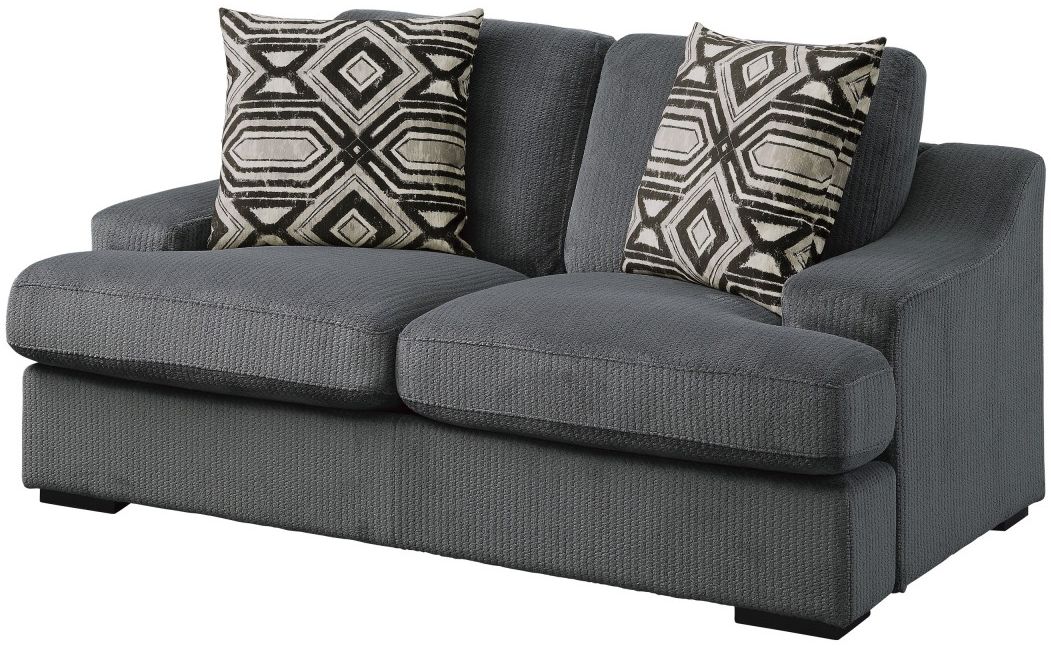The modern low profile of the Orofino Collection is combined with the plush texture of velvet in a remarkable pairing of style and comfort. The dark gray velvet offers a visually versatile pallet and a luxurious texture that enhances your seating experience. Contrast comes in the form of the geometric print toss pillows that accompany the love seat. Wood legs feature an espresso finish for discrete support.