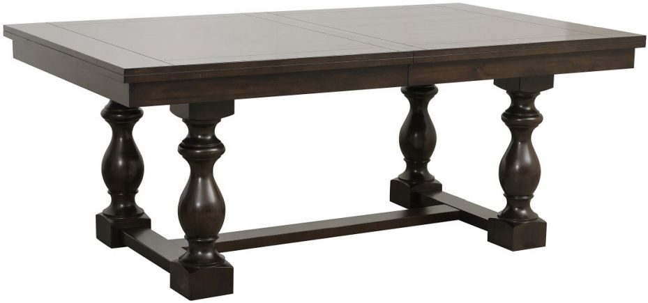 A warm and inviting addition to your dining space. A cherry finish graces the wood veneer of the dining table, which is supported by substantially appointed double turned leg bases. The tabletop extends to reveal a self-storing table leaf for quick and convenient placement.Read More