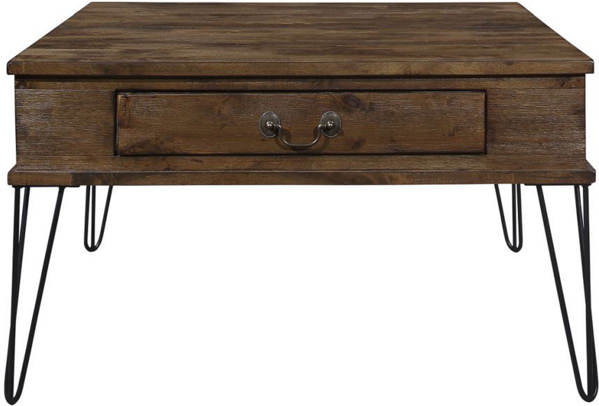 A rustic oak finish graces the natural look of the solid Asian hardwood tabletop of the square cocktail table, with a complementing accent presented in the form of the supporting black-finished metal hairpin legs. Two functional drawers front the table and feature antiqued bronze finished bale and button metal hardware.Read More