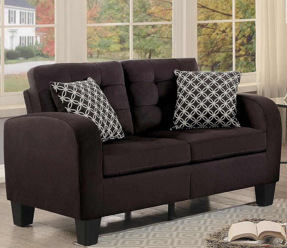 Available in either chocolate or gray fabric with contrast pillows.