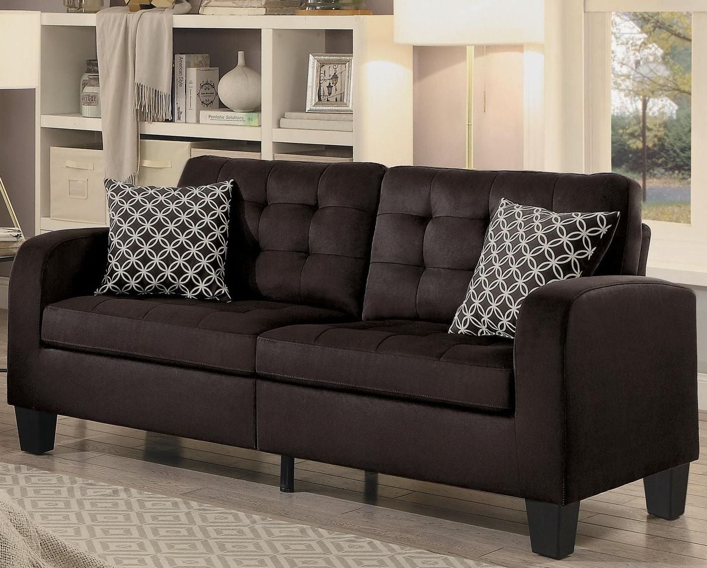 Available in either chocolate or gray fabric with contrast pillows.