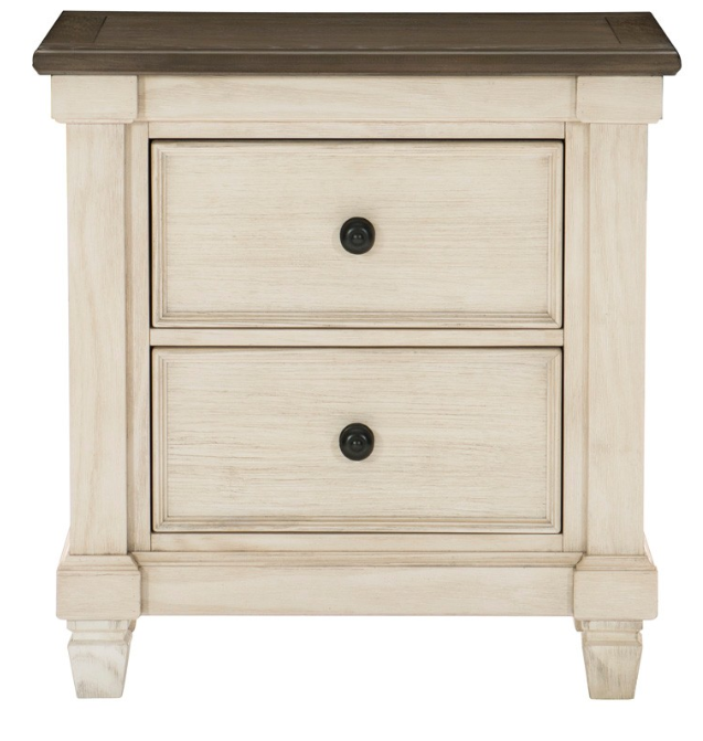 Transitional-rustic styling is expertly achieved in the design of the Weaver Collection. Antique white provides bold contrast to the brown-gray plank-style tops, with pine solids and oak veneer further lending visual texture to the bedroom. Classic framing paired with dark metal knob hardware complete the rustic look.