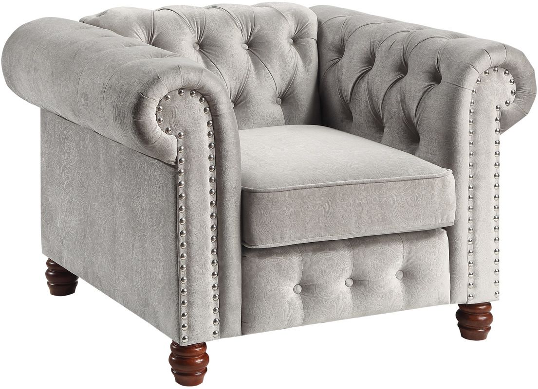 The iconic style of the Welwyn Collection exemplifies the timeless look of traditional design. This Chesterfield-style chair is covered in gray velvet and features the classic accenting of button tufting, heavily rolled arms and nailhead accent. Cherry finished wood legs provide support while complementing the velvet’s neutral tone.Read More