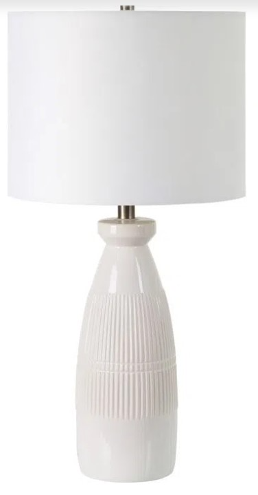 In a classic interior, this lamp infuses a smooth modern vibe. Standing 26.25 inches tall and 13 inches wide and deep, it exudes grandeur in both stature and style. The ceramic base boasts a glossy glaze finish with finely etched lines, crowned by an elegant off-white cotton shade.Read More